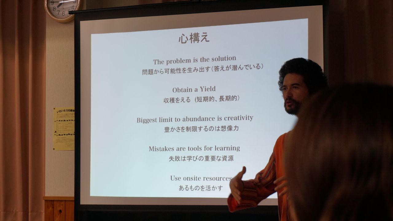 パーマカルチャーという言葉はPermanent(持続する)とAgriculture(農業)とCulture(文化)の造語だそうです。簡単に言うと自分達の暮らしを見つめ直し、持続可能な暮らしにシフトしていきましょうよということみたい。しかも楽しく。不真面目に真面目なことを。(ここを強調していました)