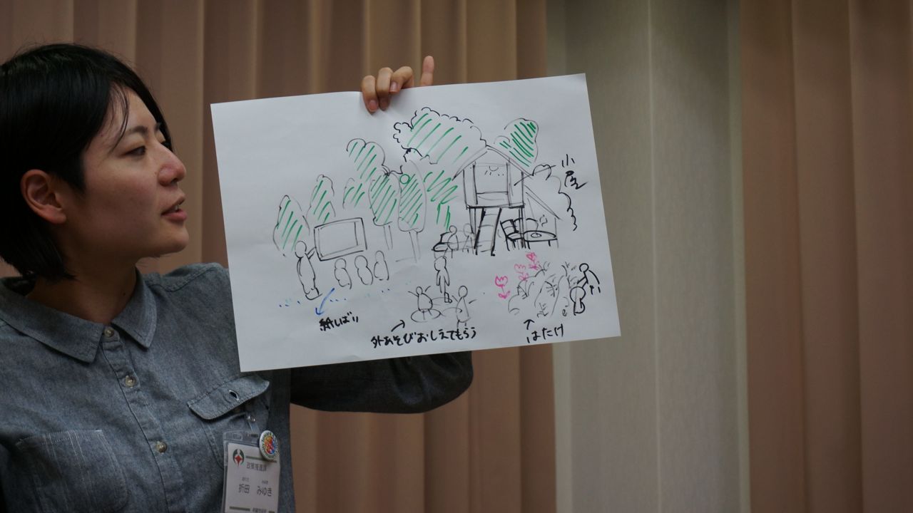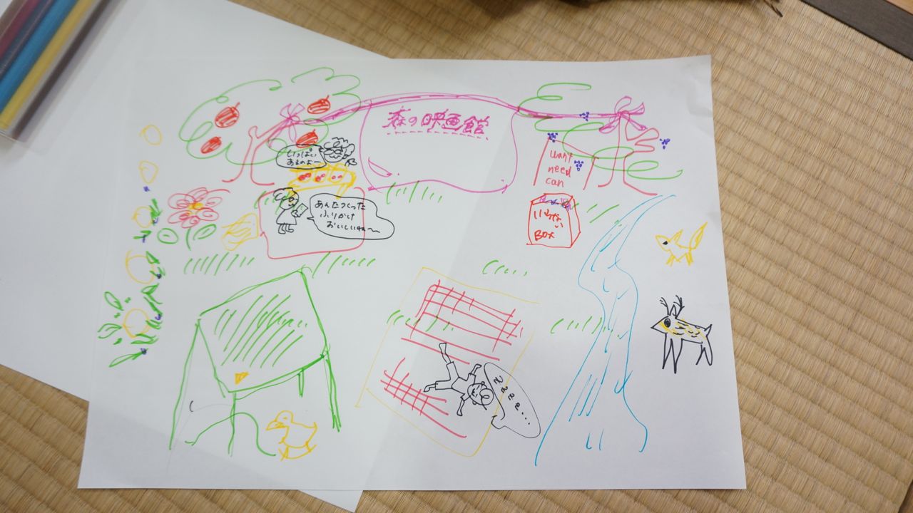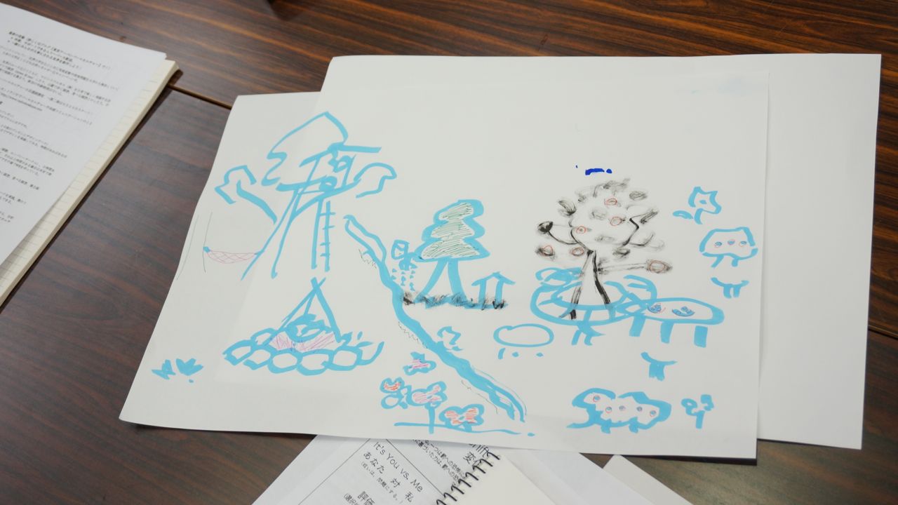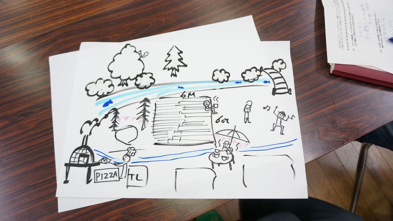最後のワークでは4人一組になって、仮想の広場または交差点を設定してどんな場所になったら楽しい場所になるか絵に描いてみるワークをしました。その絵がこちら。